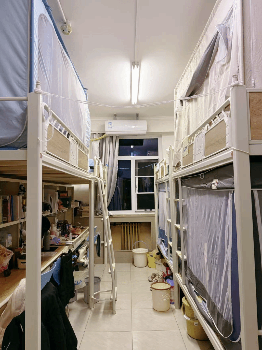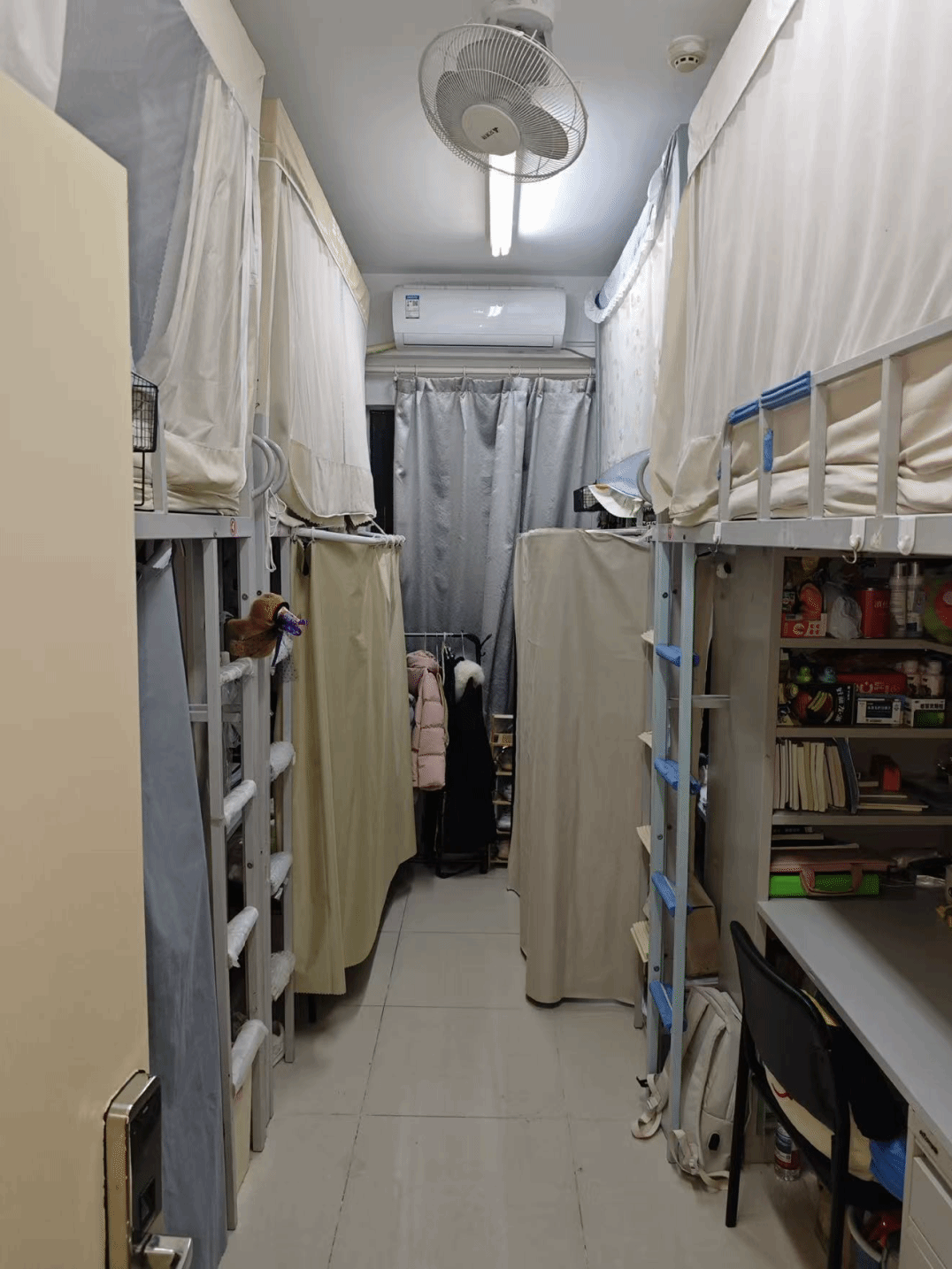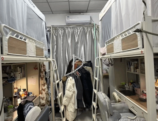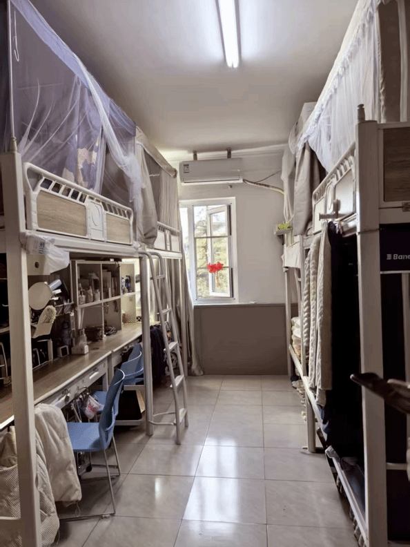 狭长寝室里,上下铺支起青春框架,床帘隔出私语角落,书桌的百态与角落的琐碎,都是鲜活的青春注脚。